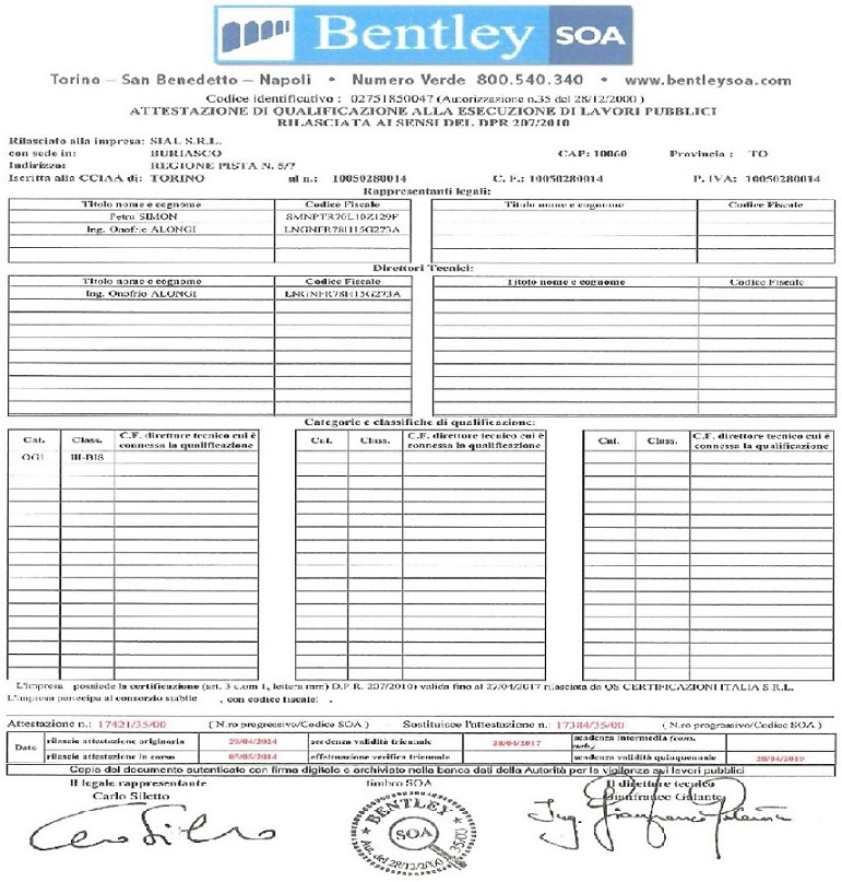La SIAL s.r.l. possiede l'Attestazione SOA rilasciata dall'istituto Bentley SOA s.p.a. mediante la quale è abilitata all'esecuzione di opere pubbliche.