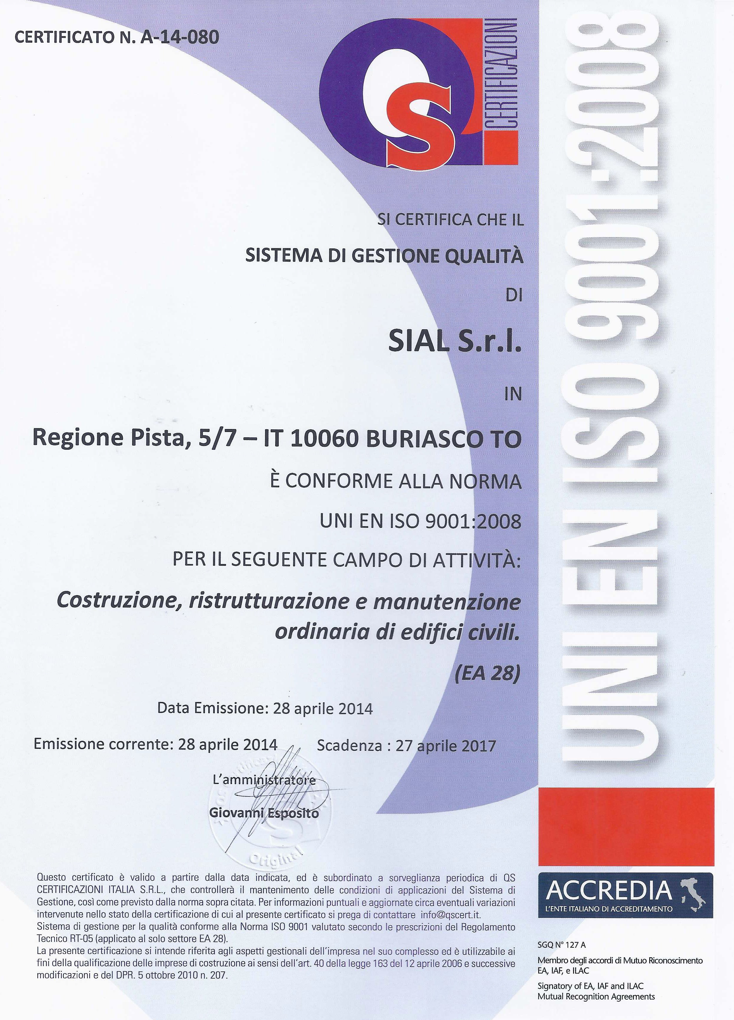 La SIAL Srl ha conseguito la certificazione di qualità aziendale secondo lo standard internazionale ISO 9001:2008, dall'ente certificatore QS CERTIFICAZIONI ITALIA, per il seguente campo di applicazione: “COSTRUZIONE, RISTRUTTURAZIONE E MANUTENZIONE ORDINARIA DI EDIFICI CIVILI”
